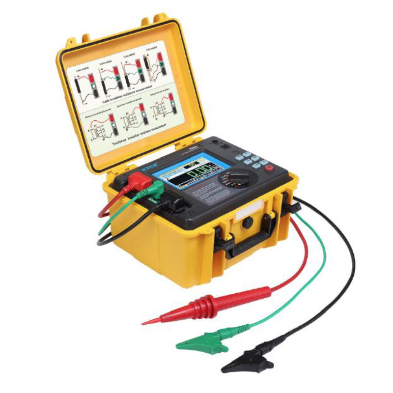 Stíněné měřicí vodiče s výměnnými koncovkami (krokosvorky, háčky) zajišťují flexibilní použití. Tester je ideální pro měření izolačního odporu kabelů, motorů, transformátorů, generátorů, induktorů, vysokonapěťových spínačů, svodičů a dalších elektrických zařízení.
