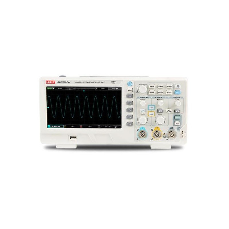 Osciloskop UTD2102CEX+ je multifunkční, vysoce výkonný stolní digitální osciloskop ze série UTD2000CEX+, který je snadno ovladatelný, s velmi dobrými technickými specifikacemi, s dvěma analogovými vstupními kanály, který nabízí šířku pásma 100 MHz se vzorkováním 1 GS/s. Je vybaven sedmipalcovým barevným TFT displejem s rozlišením 800 x 480 pixelů.