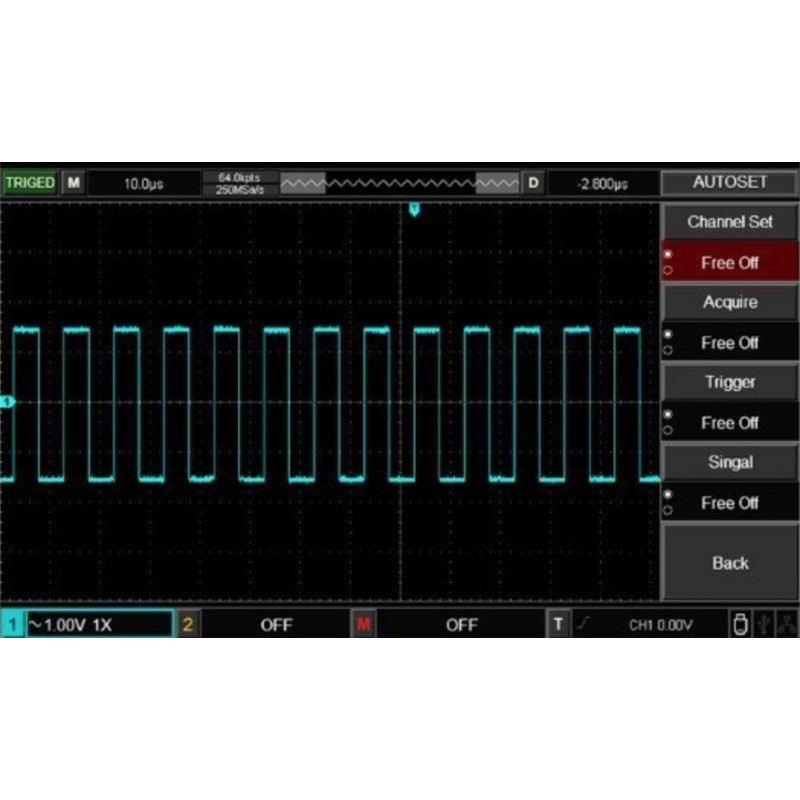 Parametry produktu: - šířka pásma: 100MHz - počet kanálů: 2 - vstupní vazba: (1MΩ±2%)//(24pF±3pF) - vstup kompenzovanéhu signálu: v rozsahu 3Vpp/1kHz - max. vstupní napětí: 400Vpk, přechodové max. 1000Vpk - vzorkování: 1GS/s - rozsah časové základny: 2ns/div až 50s/div - doba náběhu: ≤ 3,5ns - verikální osa: 1mV/div až 20V/div (1MΩ), každý kanál má samostatné vertikální menu - vertikální rozlišení: 8 bit - přesnost DC zesílení: ±3% - délka uloženého záznamu: 2 x 512k vzorkovacích bodů - hloubka paměti: jeden kanál 64kpts, dva kanály 2 x 32kpts - spouštění: Edge, Pulse, Video, Slope, Alternating trigger. - matematické operace s průběhy: A+B, A-B, AxB, A/B, FFT, Editable Advanced, Filter - automatické měření parametrů signálu: Max, Min, High, Low, Middle, Pk-Pk, Ample, Mean, Cycle Mean, RMS, Cycle RMS, Area, Cycle Area, OverShoot, PreShoot, Period, Freq, Rise, Fall, +Width, -Width, +Duty, -Duty, RiseDelay, FallDelay, Phase, FRFR, FRFF, FFFR, FFFF, FRLF, FRLR, FFLR, FFLF - počet měření: 5 souběžných měření - statistické měření: průměr, Max, Min, standartní odchylka, počet měření - frekvenční čítač: 6 bitů - standartní rozhraní: USB-Host, USB-Device, LAN, AUX (Trig Out, Pass/Fail) - softwarová tlačítka v obrazovce - softwarová klávesnice na obrazovce pro pojmenování ukládaných souborů - počet ukládaných souborů do paměti osciloskopu/na USB flesh: 20/200 - uložení aktuální obrazovky ve formátu BMP na USB flesh - vícejazyčné menu (mimo jiné anglicky, německy, francouzsky, portugalsky, španělsky, rusky)