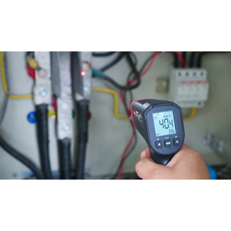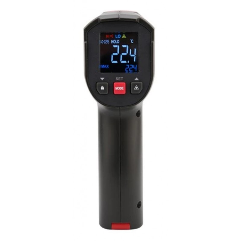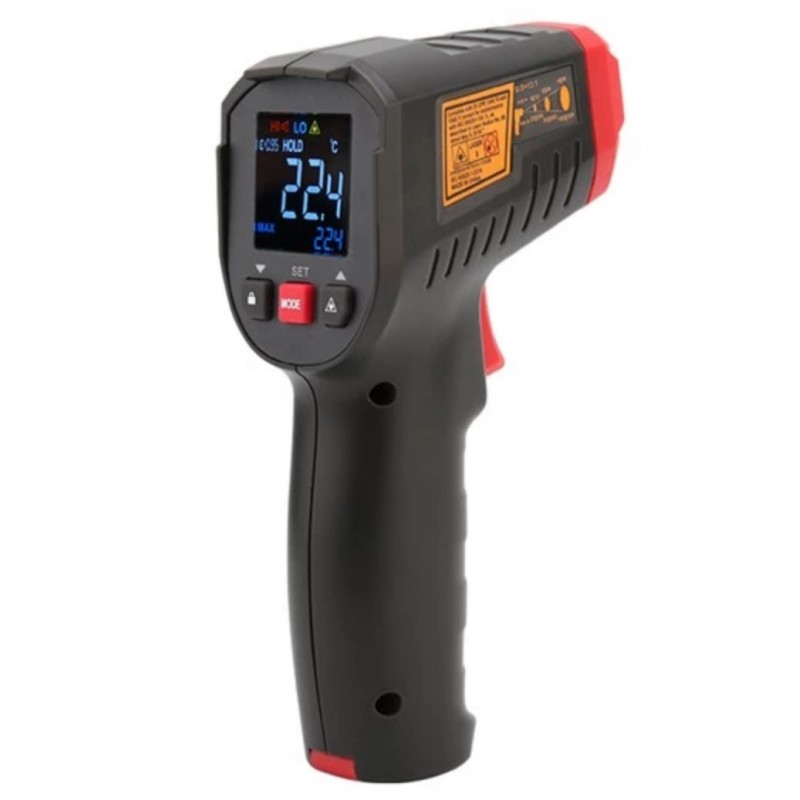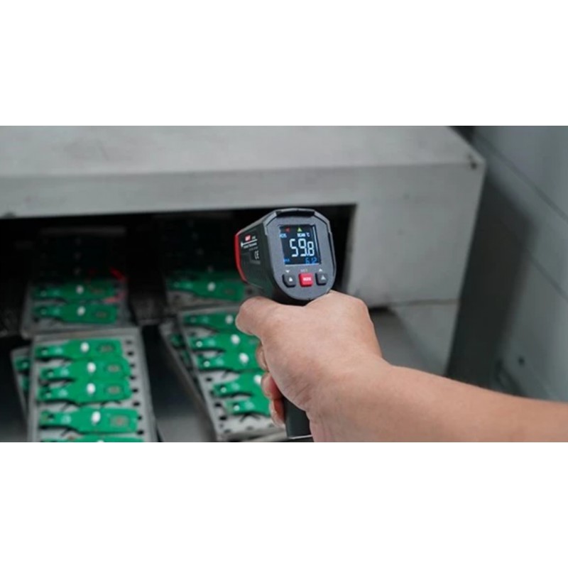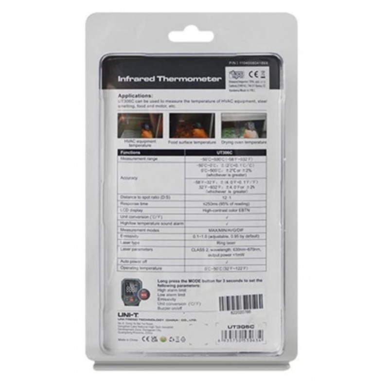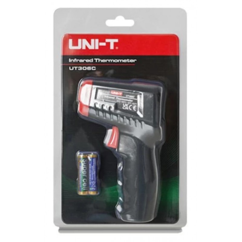 UNI-T UT306C - Bezkontaktní teploměr Profesionální bezkontaktní infračervený teploměr UT306C dokáže rychle a přesně určit povrchovou teplotu v rozmezí -50°C až +500°C změřením infračervené energie vyzařované z cílového povrchu. Pro snazší a intuitivní zaměření přístroje na cílový povrch je zabudován prstencový laser, který indikuje správné zaměření teploměru. Poměr vzdálenosti k průměru měřeného povrchu je u tohoto přístroje 12 :1. Tento teploměr je odolný proti pádu z výšky 1 metru. Je možné přednastavit emisivitu měřeného povrchu v rozmezí 0,1 až 1,0. Indikaci přednastavených funkcí a naměřených hodnot zajišťuje jasný a vysoce kontrastní EBTN barevný displej a hraniční hodnoty jsou indikovány bzučákem a na displeji. Je možná indikace minimálních, maximálních a průměrných teplot a odchylek od průměru ( MIN, MAX, AVG, DIF ). Teploměr se automaticky vypíná, kvůli snížení spotřeby, pokud je bez použití po dobu 15 s v režimu HOLD a po 10 s v ostatních režimech. Doba změření teploty je v 95% případů do 250msec. Napájení přístroje dvěma zinko-manganovými nebo nebo alkalickými bateriemi AAA 1,5V.