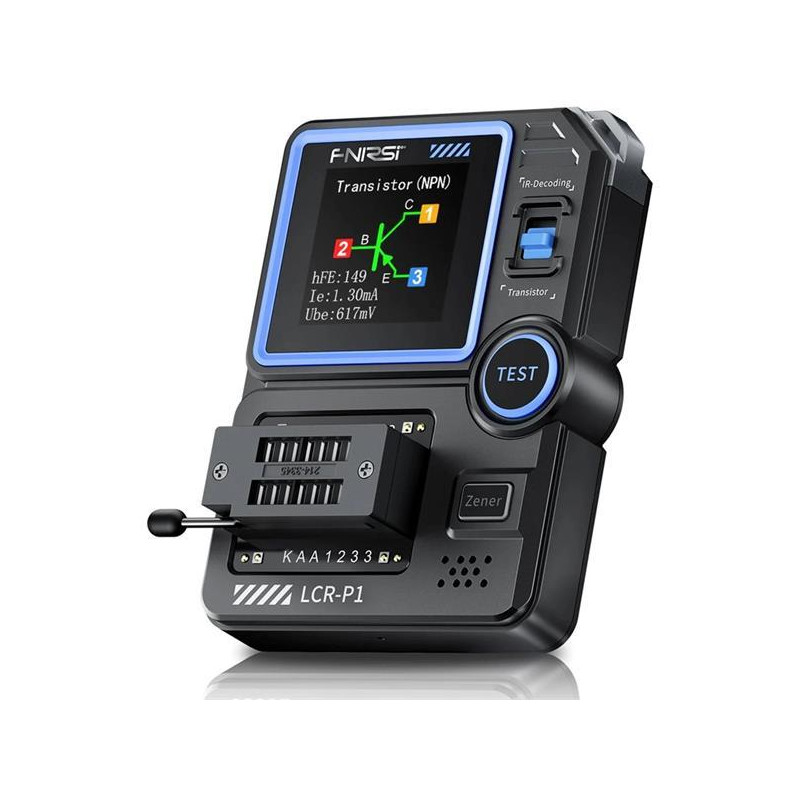 FNIRSI LCR-P1 je multifunkční digitální tester součástek a tranzistorů, který umožňuje rychlé a přesné testování různých elektronických součástek, jako jsou tranzistory, diody, kondenzátory, rezistory, induktory, součástky MOSFET a podobně. Tester LCR-P1 je vybaven 1,44" barevným displejem, což umožňuje snadné čtení výsledků testů. Zobrazuje všechny důležité parametry, jako jsou naměřené hodnoty odporu, kapacity, indukčnosti nebo specifikace tranzistorů. Barevný displej rovněž zobrazuje detaily o typu a zapojení testovaných součástek, které jsou automaticky identifikovány testerem. Tester taképodporuje analýzu infračervených kódů dle protokolu NEC, což lze využít při ladění a údržbě dálkových ovladačů.
