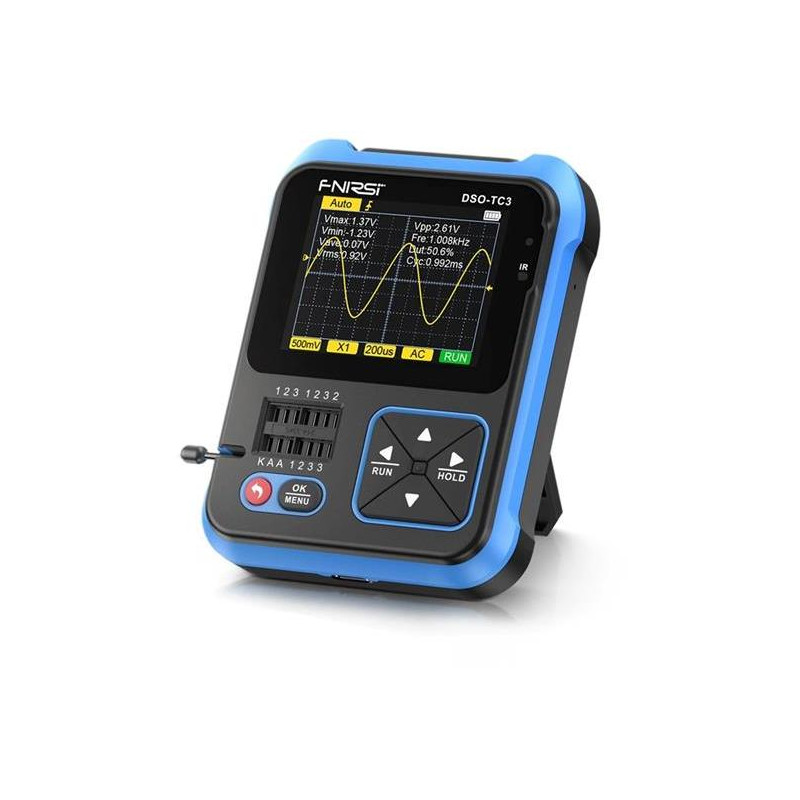 Osciloskop 500kHz, generátor funkcí a tester součástek FNIRSI DSO-TC3, je kompaktní digitální osciloskop s několika funkcemi:
