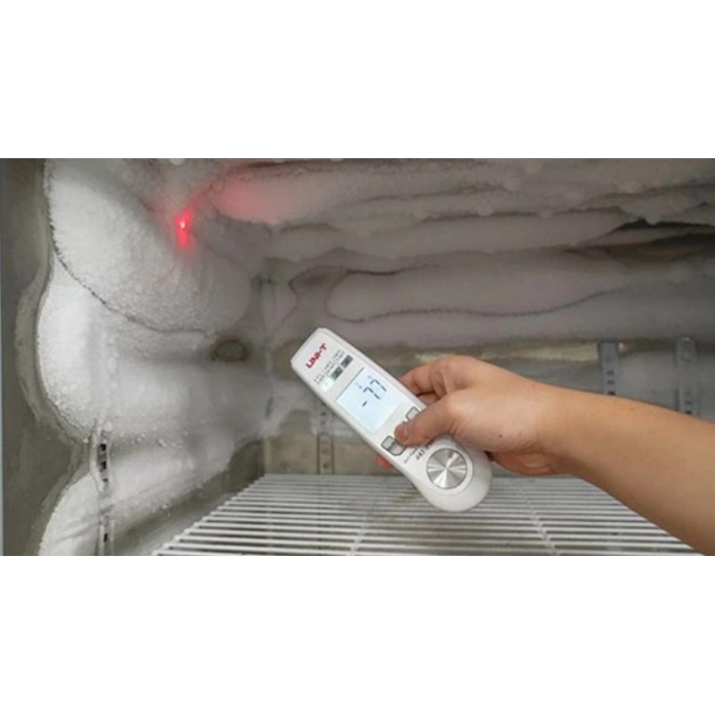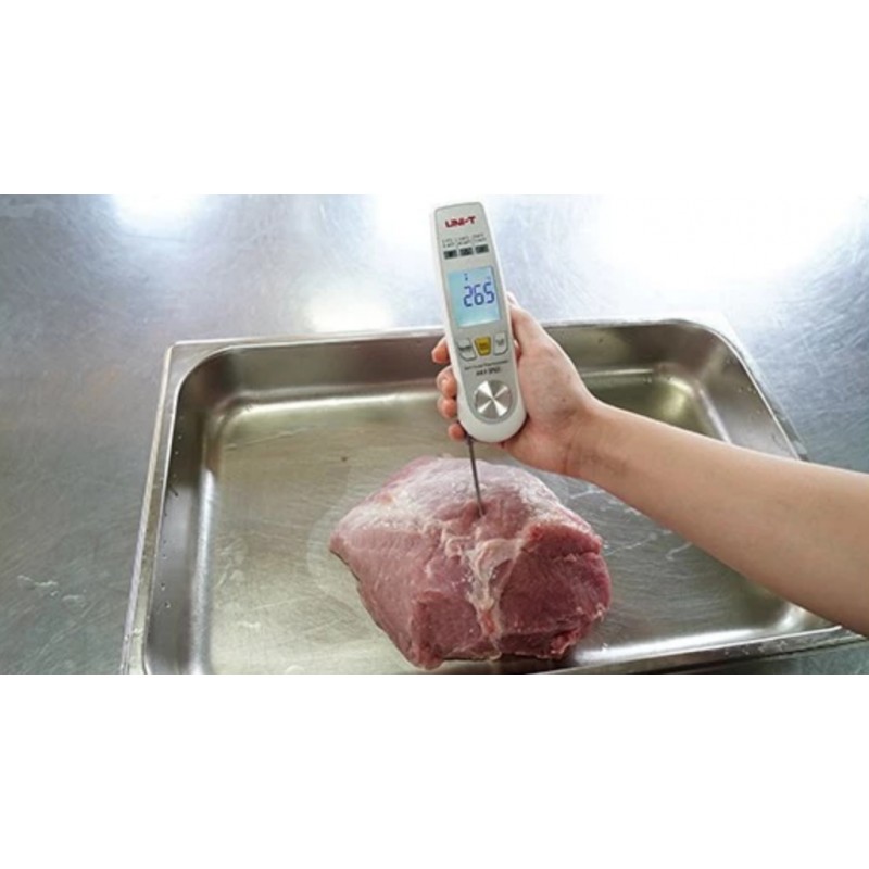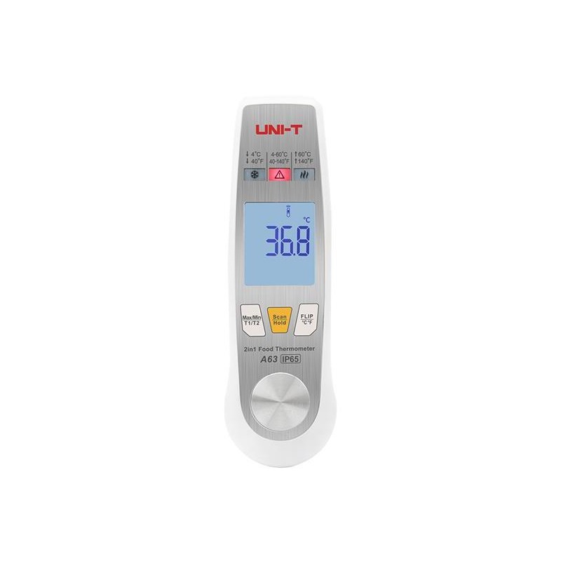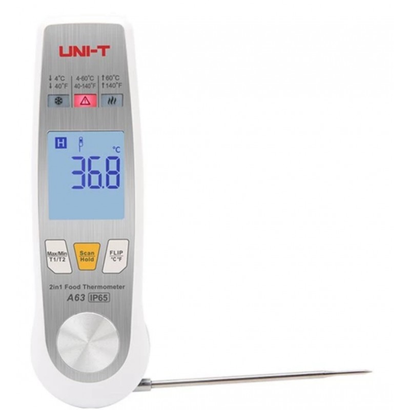 UNI-T A63 - Potravinařský teploměr 2v1 Potravinářský teploměr A63 ( 2v1 ) , je potravinářský teploměr kombinovaný s infračerveným senzorem a skládací sondou. Poskytuje ideální řešení pro měření a monitorování teploty pro profesionály v potravinářském průmyslu. Infračervený režim dokáže rychle snímat povrchovou teplotu předmětů a režim sondy se používá pro přesné měření vnitřní teploty potravin. Má indikátor teplotního rozsahu, tato funkce se hodí pro HACCP (analýza rizik a kritický kontrolní bod), aby byla zajištěna bezpečnost potravin. Tento teploměr je vhodný pro zpracování potravin, přepravu potravin, skladování, stravovací průmysl a další.
