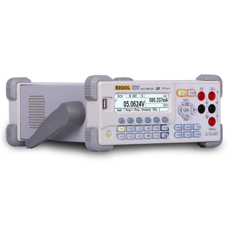 Rigol DM3058 - Stolní multimetr Přesné měření: Rozlišení 5 1/2 dig., rychlost 123kr/s. Rozsah napětí: DC až 1000V, AC (RMS) až 750V (20Hz-100kHz). Odolnost proti proudu: DC do 10A, AC (RMS) do 10A (20Hz-10kHz). Odpor: 100MΩ (2-drátově i 4-drátově). Kapacitní měření: Do 10mF. Měření frekvence a periody: 200mV-750V, až 1MHz. USB, LAN, RS-232, GPIB,...