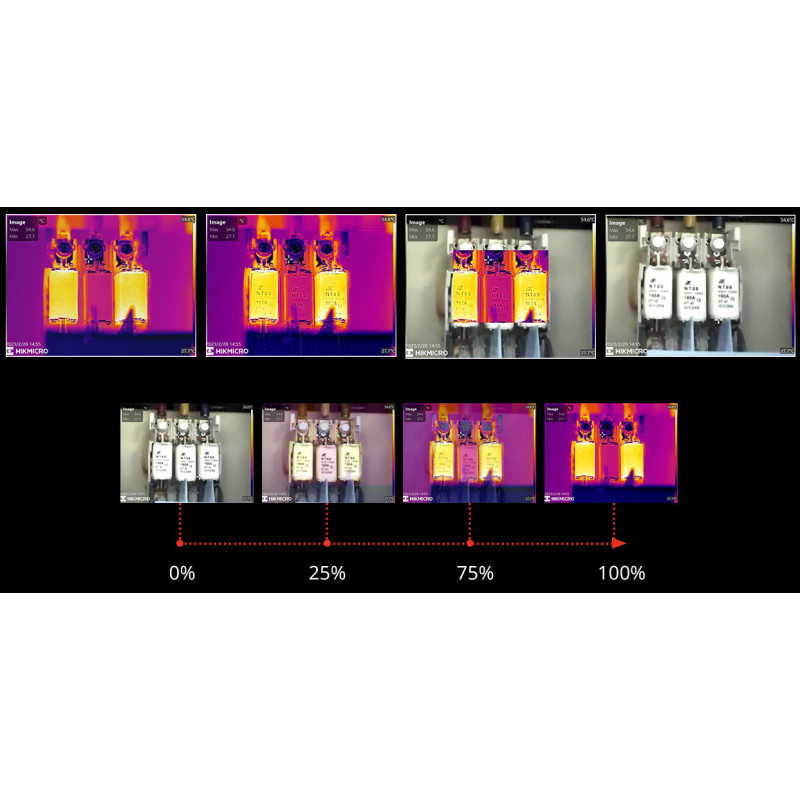 - Provozní režimy - plné IR zobrazení, kombinovaný snímek s detekcí hran, prolnutí IR a viditelného snímku, obraz v obraze PIP a plné zobrazení ve viditelném spektru