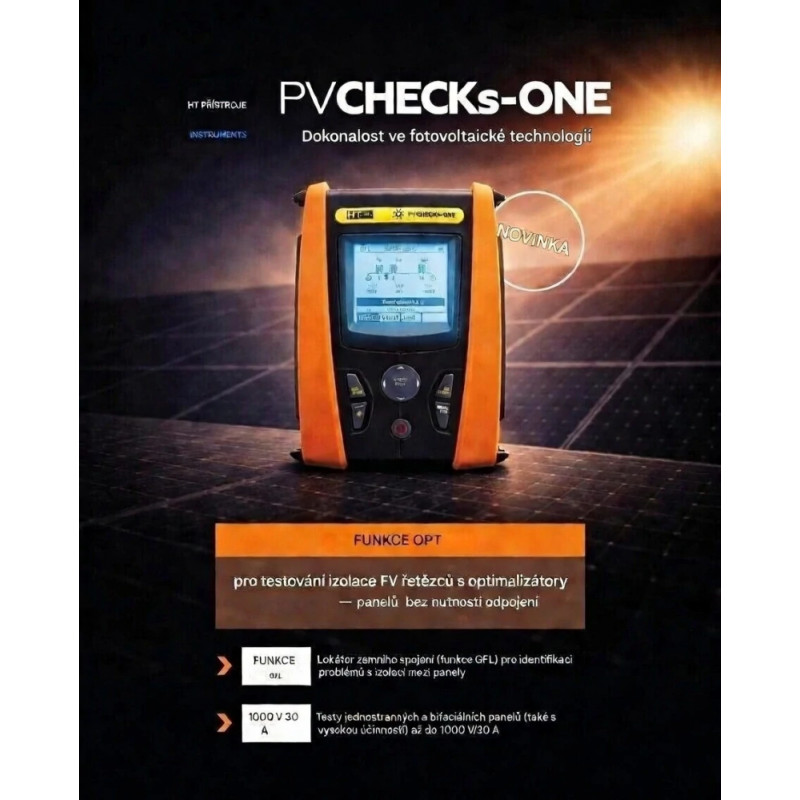 Multifunkční přístroj PVCHECKs-ONE umožňuje rychlé a bezpečné provedení všech testů elektrické bezpečnosti na stejnosměrné (DC) části fotovoltaického systému, včetně měření napětí naprázdno (Voc) a zkratového proudu (Isc) panelů a řetězců dle normy IEC/EN 62446.