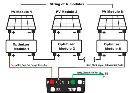 Funkce OPT – navržena pro měření izolačního odporu aktivních vodičů na fotovoltaických (FV) řetězcích v souladu s normami IEC/EN 62446-1 a IEC/EN 61557-2. Měření lze provádět i v přítomnosti zařízení MLPE (např. výkonové optimizéry nebo RSD) bez nutnosti jejich odpojování od panelů, což výrazně zjednodušuje testování bez zásahu do instalace.